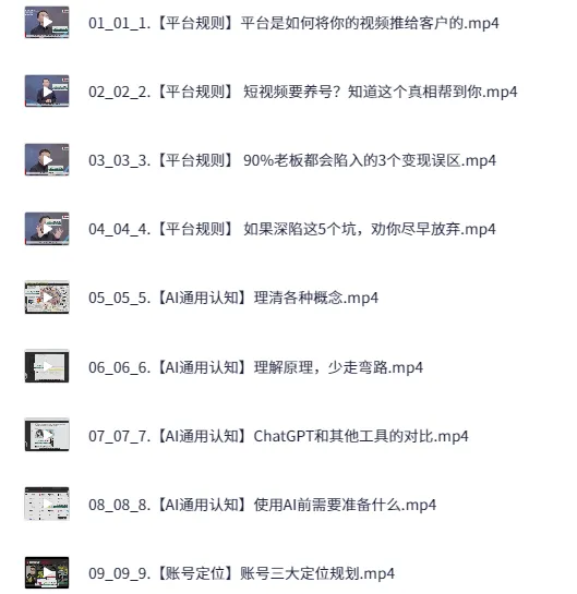 AI+短视频获客快训营+剪辑课。 想借短视频开辟财富通道? 别错过 AI + 短视频获客快训营! 100 节课程全流程覆盖,从平台规则、账号搭建,到 AI 工具运用、内容创作与剪辑实操,系统教学。 借助 AI 智能找对标、写脚本、做剪辑,零基础也能快速上手,开启短视频流量变现新篇 。 ├── 01_01_1.【平台规则】平台是如何将你的视频推给客户的.mp4 ├── 02_02_2.【平台规则】 短视频要养号?知道这个真相帮到你.mp4 ├── 03_03_3.【平台规则】 90%老板都会陷入的3个变现误区.mp4 ├── 04_04_4.【平台规则】 如果深陷这5个坑,劝你尽早放弃.mp4 …...