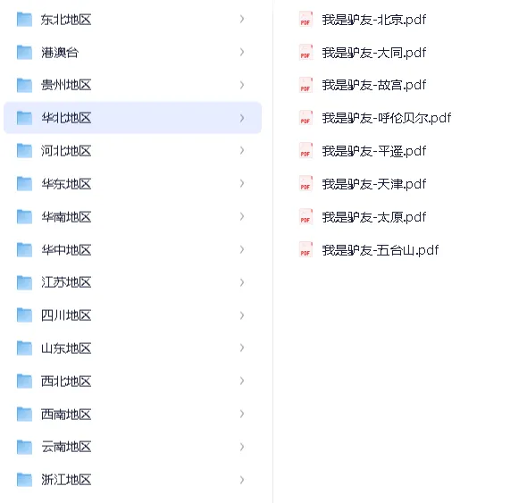我是驴友 国内旅游攻略PDF,按照省市打包文件,该合集汇集了全国主要旅游目的地的攻略PDF文件,涵盖东北、云南、华东、华中、华北、华南、四川、山东、江苏、河北、浙江、港澳台、西北、西南和贵州等区域。每个地区均包含重点城市与景点的详细资料,适合自由行、亲子游、深度游等不同需求的游客参考。
