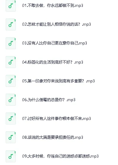 墨菲定律:避开人生倒霉的20个坑,课程。这套音频课程以夸张的形式呈现生活中可能遇到的20种“倒霉”情境,揭示隐藏在不幸背后的思维规律,帮助学习者从自我认知与沟通技巧层面构建应对策略,提高决策质量并减少失误。旨在通过20讲音频引导学习者沉着应对突发状况,减少意外损失,并从错误中获得反思与成长。每一讲都围绕一个常见误区展开,结合日常案例与心理学原理,为学习者提供切实可行的应对建议。该课程适合渴望提升自我认知、强化沟通影响力和优化心态管理的群体。 ├── 00.发刊词:墨菲定律:避开人生倒霉的20个“坑”.mp3 ├── 01.不敢去做,你永远都做不到.mp3 ├── 02.怎样才能让别人相…...