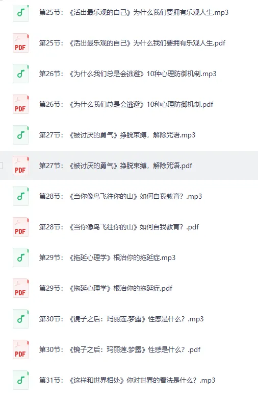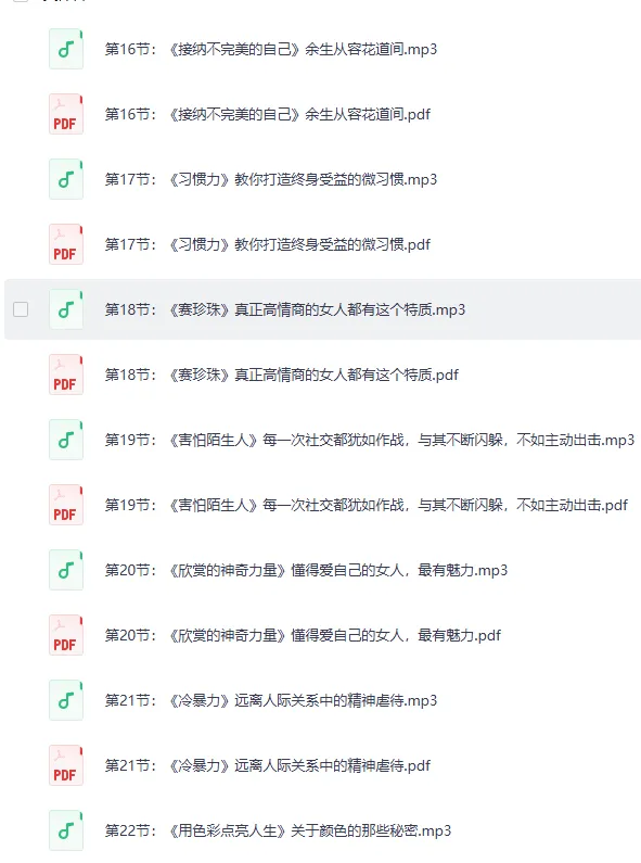 40部女神书单,读书的女人不怕老(完结)【PDF/MP3】【1.3GB】-夸克网盘资源下载地址由网盘用户[夸父*765]分享,包含mp3,pdf等格式共计80个文件,文件大小为1.25GB,分享时间2025-01-03,此夸克网盘资源由搜课100网盘搜索引擎收集整理。...