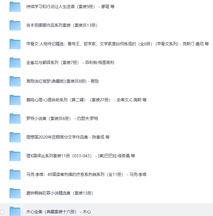 优秀套装作品合集 100套(近2000册)。 这次分享给大家的是一个优秀套装整合包,内容非常棒,都是高分套装书,篇幅过长,自己看网盘吧,内容不会让你们失望,建议转存到你们自己的网盘,随时可以下载~~ ├── 三联·哈佛燕京学术丛书(套装9册) - 石昌渝 ├── 三联·生活书店 中国社会学经典文库(套装13册) - 费孝通 等 ├── 三联学术丛书(套装共12册) - 杨绛 等 ├── 三全本之国学入门经典合集(套装共7册) (中华书局) - 马天祥 等 ├── 四书五经(套装全21册) - 陈晓芬 & 徐儒宗 ├── 十三经译注(共十六册)(上海古籍出版社经典) - 李民 等 ├──…...