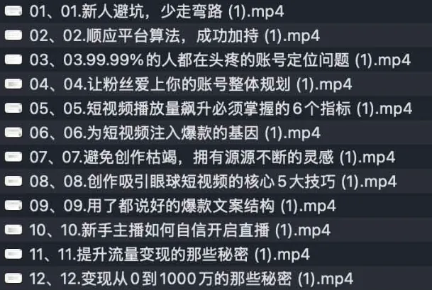 从0到1短视频创作变现必修课。 了解自媒体短视频账号那些新手的坑、寻找自己的账号定位、爆款涨粉的骚操作、变现才是硬道理,跟随时代趋势,人人需要的技能。 ├── 01、01.新人避坑,少走弯路.mp4 ├── 02、02.顺应平台算法,成功加持.mp4 ├── 03、03.99.99%的人都在头疼的账号定位问题.mp4 ├── 04、04.让粉丝爱上你的账号整体规划.mp4 ├── 05、05.短视频播放量飙升必须掌握的6个指标.mp4 ├── 06、06.为短视频注入爆款的基因.mp4 ├── 07、07.避免创作枯竭,拥有源源不断的灵感.mp4 ├── 08、08.创作吸引眼球短视频的核心5…...