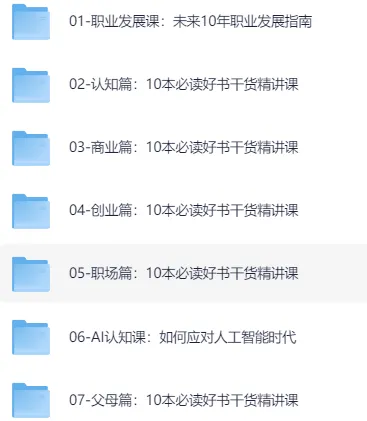 未来10年职业发展规划指南。 本课程为您提供未来十年职业发展规划指南,帮助您了解行业趋势、技能需求与职业机会。通过职业规划、自我评估和目标设定,引导您制定个性化发展蓝图。探索新兴领域,拓展职业边界,实现长期职业目标。 ├── 01-职业发展课:未来10年职业发展指南 ├── 02-认知篇:10本必读好书干货精讲课 ├── 03-商业篇:10本必读好书干货精讲课 ├── 04-创业篇:10本必读好书干货精讲课 ├── 05-职场篇:10本必读好书干货精讲课 ├── 06-AI认知课:如何应对人工智能时代 ├── 07-父母篇:10本必读好书干货精讲课...