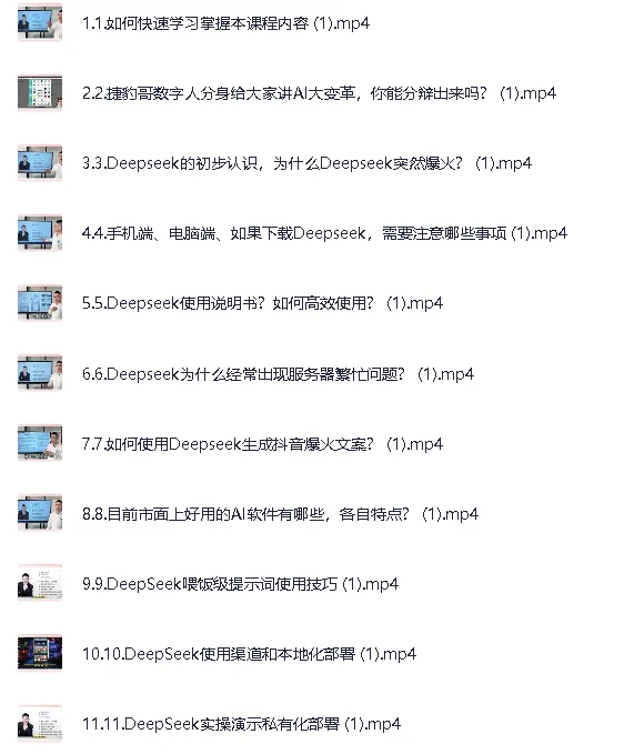 《DeepSeek应用实战先导课》是一套系统化的大模型实战课程,聚焦DeepSeek在日常工作、副业与创作中的高频场景。从安装与配置,到提示词技巧、工具联动与行业落地,课程以案例驱动,帮助学员快速掌握并应用AI,打造个人专属的高效生产力体系。 ├── 1.1.如何快速学习掌握本课程内容 (1).mp4 ├── 2.2.捷豹哥数字人分身给大家讲AI大变革,你能分辩出来吗? (1).mp4 ├── 3.3.Deepseek的初步认识,为什么Deepseek突然爆火? (1).mp4 ├── 4.4.手机端、电脑端、如果下载Deepseek,需要注意哪些事项 (1).mp4 ├── 5.5.Deep…...