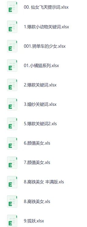 最新9800组热门AI提示词。 最新9800组热门AI提示词 ├── 00. 仙女飞天提示词.xlsx ├── 1.爆款小动物关键词.xlsx ├── 001.骑单车的少女.xlsx ├── 01.小橘猫系列.xlsx ├── 2.爆款关键词.xlsx ├── 3.婚纱关键词.xlsx ├── 5.爆款关键词2.xls ├── 6.颜值美女.xls ├── 7.颜值美女.xls ├── 8.高铁美女 丰满版.xls ├── 8.高铁美女.xls ├── 9.狐妖.xlsx ├── 10.萌娃.xlsx ├── 11.打工猫系列.xlsx ├── 12.熊猫系列.xlsx ├── 13.慈祥老人…...