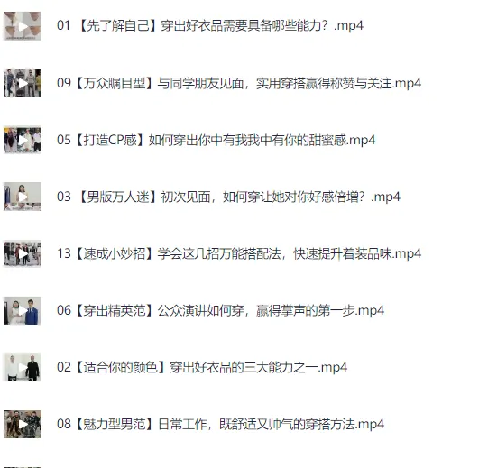 直男穿搭术 拯救宇宙直男衣品强效指南,直男必修课,老光私享 贝基色彩联合出品。 很多男士之所以穿不好,无非是没时间、没审美、没兴趣和不懂搭配,所以如果女人、搭配师、导购能为他们提供整套解决方案,问题便迎刃而解! 《直男穿搭术》从风格、体型、到款式、色彩再到场合,13节课一站式解决男士穿搭问题;告别油腻,穿出影响力! ├── 【创刊词】你为什么要学直男穿搭?.mp4 ├── 01 【先了解自己】穿出好衣品需要具备哪些能力?.mp4 ├── 02【适合你的颜色】穿出好衣品的三大能力之一.mp4 ├── 03 【男版万人迷】初次见面,如何穿让她对你好感倍增?.mp4 ├── 04【浪漫罗密欧】日常约…...