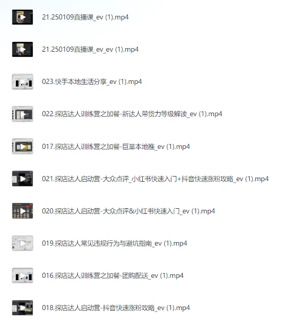 探店达人训练营,素人变达人,花钱变赚钱。 探店达人训练营系统化教学素人转型本地生活领域达人,覆盖抖音、大众点评、小红书多平台运营策略,解析团购达人与探店达人差异及变现路径。课程从账号定位、竞品分析切入,详解抖音算法规则与避坑指南,传授爆款选品逻辑、脚本结构拆解及拍摄剪辑技巧,配套DOU+精准投流与巨量本地推实战方法。内容包含高效涨粉攻略、直播表现力提升及带货力等级解读,帮助学员掌握内容创作、数据分析到多元变现(团购配送/直播带货)的全链路技能,适配餐饮、旅游等本地商家合作需求,实现从内容生产到商业转化的闭环运营。 ├── 001.【课前须知】素人变达人,花钱变赚钱!探店达人训练营_ev (1)…...