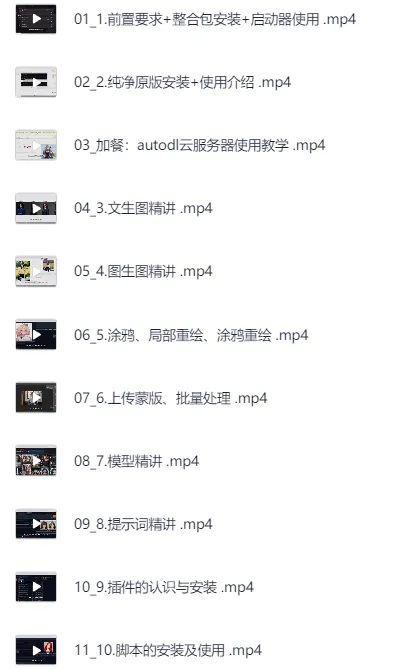 零基础学AI绘画,手把手教你从0基础入门Stable Diffusion,资源下载。00-课程目录.png01-AIGC绘画方案及试用.mp402-如何用Stable Diffusion开始一幅AI绘画.mp403-看看提示词有哪些玩法.mp404-更进一步:大模型进阶玩法.mp405-上手试试Stable Diffusion的精准可控.mp406-Stable Diffusion的精准可控(实战).mp407-微调模型让数字人成为可能.mp408-数字人之Embeddings及Hypernetwork.mp409-数字人之Dreambooth及LoRA.mp410-Al绘画的商业化落地思考及…...