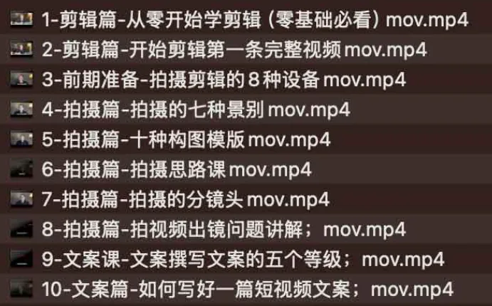 从零开始入门短视频的拍摄剪辑。 课程内容涵盖短视频拍摄基础知识(如构图、光线、声音等)、剪辑软件的使用、剪辑技巧与流程、特效与转场的运用、音效与配乐的添加、以及如何优化视频以提高观看率和互动性等。 通过实战演练与项目实践,帮助学员从零基础快速掌握短视频的拍摄与剪辑技能,能够独立制作高质量的短视频内容。 ├── 1-剪辑篇-从零开始学剪辑(零基础必看)mov.mp4 ├── 2-剪辑篇-开始剪辑第一条完整视频mov.mp4 ├── 3-前期准备-拍摄剪辑的8种设备mov.mp4 ├── 4-拍摄篇-拍摄的七种景别mov.mp4 ├── 5-拍摄篇-十种构图模版mov.mp4 ├── 6-拍摄篇-…...