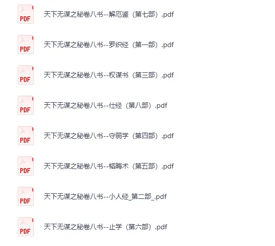 天下无谋之秘卷八书 书名:天下无谋之秘卷八书 作者:合集 格式:PDF 标签:国学 谋略 日期:2025-06-20 该书讲述了《天下无谋之秘卷八书(套装共8册)》在古代涉及权术谋略的古籍中,挑选出八本最具有指导性和谋略价值的,进行了全面的整理,系统的注释,引经据典,读来令人豁然开朗。 历史总是惊人的相似,从这些书中,读者不仅能很好地重温历史,更能以史为鉴,指导自己在生活上、工作上、商场上、人际交往上更好地解决难题。...