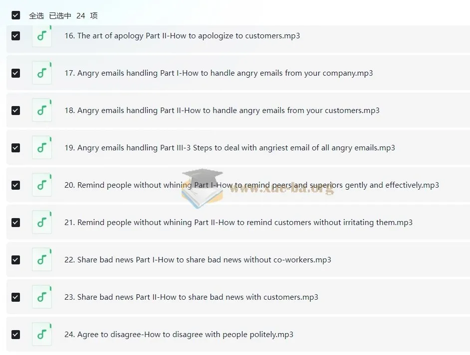 Wise Email Writing 商务英语邮件写作系列课程,课程。 本课程系统化解析商务邮件全场景写作技巧,涵盖积极能量表达四法则、面试感谢信撰写模板及客户投诉应对策略。重点指导如何运用正面语言构建温暖有力的感谢邮件,通过三步骤处理极端愤怒邮件,并掌握向上级/同事/客户道歉的艺术。课程包含建设性反馈的”该做与禁忌”原则、优雅离职信撰写方法及异议表达技巧,同步解析求职自荐信吸引力提升策略与坏消息传递话术。针对职场常见痛点提供无抱怨式催办技巧与跨部门协调方案,配套客户维护邮件模板与危机处理流程,适用于外贸沟通、内部协作、客户关系管理等多元场景,帮助学员全面提升邮件沟通效率与职业形象。 ├── …...