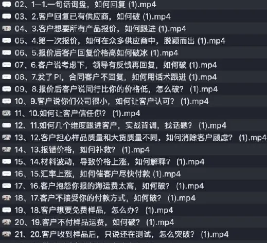 你具体话术怎么说+提高营销思维 遇到典型问题,如何巧妙回复+营销思维 适合谁学 外贸小白—外贸老鸟—-外贸经理—老板—外贸SOHO—-用来培训外贸业务 从源头解决大家问题 订单转化低 报价后客户不回复 客户抱怨价格高 不知道如何具体找话题 订单一直卡在测试环节 付款方式出现分歧 帮你解决的,不只是这些问题 课程大纲: 01、1.导读,如何学好这套话术课(1).mp4 02、1-1.一句话询盘,如何回复(1).mp4 03、2.客户回复已有供应商,如何破(1).mp4 04、3.客户想要所有产品报价,如何跟进(1).mp4 05、4.第一次报价,如何在众多供应商中,脱颖而出(1).mp4 06、…...