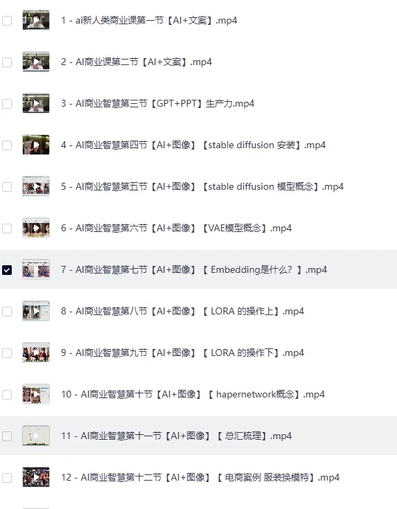 AI商业智慧【AI+文案+PPT+图像+视频】。 在数字化浪潮中,人工智能正深度赋能商业场景,通过智能工具链重塑内容创作与传播模式。 从精准抓取用户痛点的AI文案生成,到一键排版、数据可视化的PPT智能设计;从个性化图像素材的快速合成,到全流程自动化视频剪辑与特效处理,AI技术正在构建覆盖文字、视觉、演示与动态影像的全方位解决方案。 这种多维度协同不仅大幅提升创作效率,更能通过数据洞察生成更符合市场需求的商业内容,助力企业在信息洪流中精准触达目标受众,打造差异化竞争力。 ├── 1 - ai新人类商业课第一节【AI+文案】.mp4 ├── 2 - AI商业课第二节【AI+文案】.mp4 ├──…...