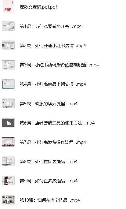 小红书电商运营从入门到精通,这是一套覆盖小红书电商完整链路的实操课程,包含入驻与开店、后台设置、商品上架、客服与发货、内容生产与发布、站内外选品、活动与优惠配置、数据分析与复盘,以及私域导流与变现。配套资料含《店铺入驻全流程》《爆款文案词》,并附「看课指南」便于快速上手。