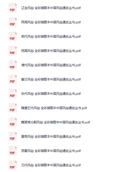 全彩插图本中国风俗通史丛书 (全十三卷)。 《全彩插图本中国风俗通史丛书》是由上海文艺出版社出版的一套系统研究中国历代风俗文化的学术著作,全套共13卷,涵盖从原始社会到民国的历史断代,被学术界视为中国风俗史研究的代表性著作。 ├── 辽金风俗 全彩插图本中国风俗通史丛书.pdf ├── 两周风俗 全彩插图本中国风俗通史丛书.pdf ├── 明代风俗 全彩插图本中国风俗通史丛书.pdf ├── 民国风俗 全彩插图本中国风俗通史丛书.pdf ├── 清代风俗 全彩插图本中国风俗通史丛书.pdf ├── 秦汉风俗 全彩插图本中国风俗通史丛书.pdf ├── 宋代风俗 全彩插图本中国风俗通史丛书.pd…...