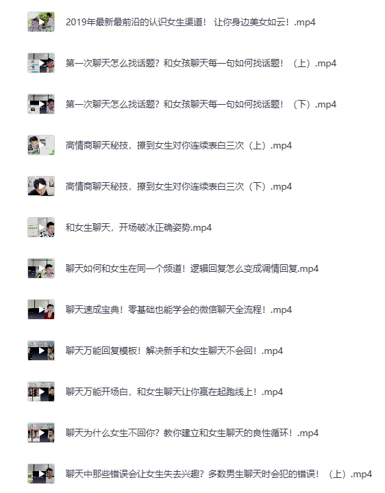 介绍 爱上情感-恋爱精品课-聊天三十六计,课程。 爱上情感-恋爱精品课-聊天三十六计是一套关于恋爱聊天技巧的课程,重点讲解如何避免聊天中的常见错误,提升与女生的互动质量。内容涵盖破解女生的“废物测试”、应对特殊情况、识别网络骗局、找到有效的话题、让聊天更有趣,以及如何让逻辑回复变得更具吸引力。课程还针对不同关系阶段提供实用技巧,帮助男性更自信地建立和发展亲密关系。 ├── 第一次聊天怎么找话题?和女孩聊天每一句如何找话题!(上).mp4 ├── 第一次聊天怎么找话题?和女孩聊天每一句如何找话题!(下).mp4 ├── 大部分男人微信聊天的错误行为!建立正确聊天心态.mp4 ├── 教会你识别所…...