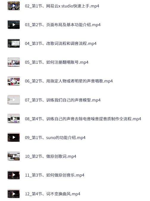 AI音乐全链路实战变现课:零基础3天掌握原创、翻唱、变现。 AI音乐全链路实战变现课,零基础3天掌握原创、翻唱、变现 ├── 02_第1节、网易云x studio快速上手_ev.mp4 ├── 03_第2节、页面布局及基本功能介绍_ev.mp4 ├── 04_第3节、改歌词流程和调音流程_ev.mp4 ├── 05_第1节、如何注册翻唱账号_ev.mp4 ├── 06_第2节、用指定人物或者明星的声音唱歌_ev.mp4 ├── 07_第3节、训练我们自己的声音模型_ev.mp4 ├── 08_第4节、训练自己的声音去除电音噪音提音质制作全流程_ev.mp4 ├── 09_第1节、suno的功能…...