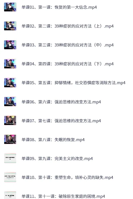 21天走出焦虑抑郁系统课程。 这门21天系统课程帮助学员走出焦虑与抑郁。 通过认知行为疗法、情绪调节技巧和生活方式改善,学员将学习自我管理、情绪释放、压力缓解和积极心态培养等方法。 课程结合理论与实践,通过日常练习帮助学员重获生活的平衡与愉悦感。 ├── 单课01、第一课:恢复的第一大信念.mp4 ├── 单课02、第二课:39种症状的应对方法(上).mp4 ├── 单课03、第三课:39种症状的应对方法(中).mp4 ├── 单课04、第四课:39种症状的应对方法(下).mp4 ├── 单课05、第五课:抑郁情绪,社交恐惧症等消除方法.mp4 ├── 单课06、第六课:强迫思维的改变方法.m…...