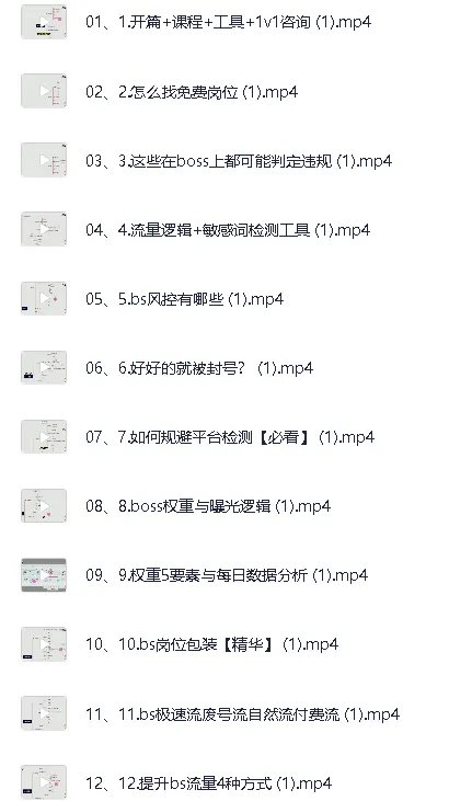 介绍 Boss直聘流量全流程揭秘,从0到1起号到转化的完整实战拆解,本课程聚焦 Boss直聘平台的流量运营与转化实战,通过完整的案例拆解与工具演示,帮助学员从零起号到实现高效转化。内容涵盖账号搭建、岗位包装、流量逻辑、风控机制、防封策略以及多渠道引流转化,形成一套完整的闭环体系,适合想要深耕 Boss直聘的运营者与电商从业者。...