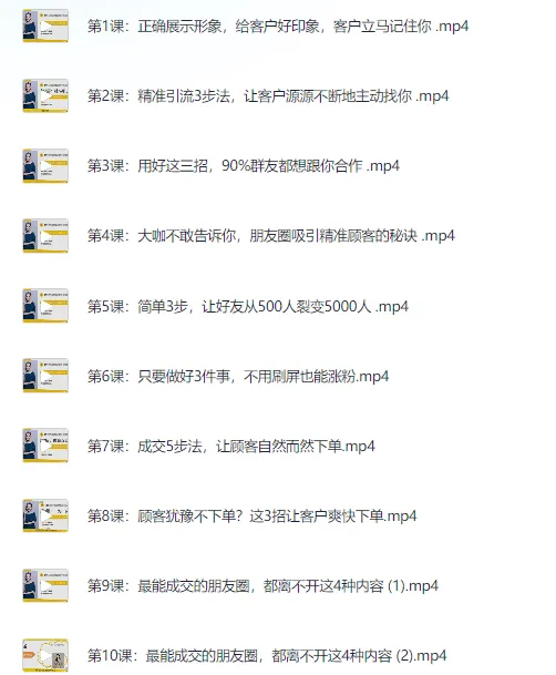 精准引流术:11招引流实战方法,让你私域流量加到爆(11节课完整)。 ├── 第1课:正确展示形象,给客户好印象,客户立马记住你 .mp4 ├── 第2课:精准引流3步法,让客户源源不断地主动找你 .mp4 ├── 第3课:用好这三招,90%群友都想跟你合作 .mp4 ├── 第4课:大咖不敢告诉你,朋友圈吸引精准顾客的秘诀 .mp4 ├── 第5课:简单3步,让好友从500人裂变5000人 .mp4 ├── 第6课:只要做好3件事,不用刷屏也能涨粉.mp4 ├── 第7课:成交5步法,让顾客自然而然下单.mp4 ├── 第8课:顾客犹豫不下单?这3招让客户爽快下单.mp4 ├── 第9课:最…...