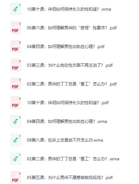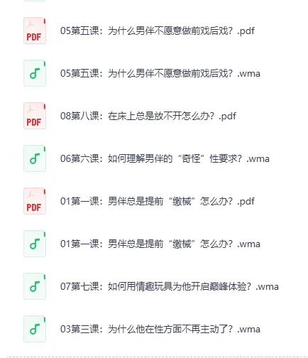 01第一课:男伴总是提前“缴械”怎么办?.pdf 01第一课:男伴总是提前“缴械”怎么办?.wma 02第二课:男伴的丁丁总是“罢工”怎么办?.pdf 02第二课:男伴的丁丁总是“罢工”怎么办?.wma 03第三课:为什么他在性方面不再主动了?.pdf 03第三课:为什么他在性方面不再主动了?.wma 04第四课:如何理解男性出轨性心理?.pdf 04第四课:如何理解男性出轨性心理?.wma 05第五课:为什么男伴不愿意做前戏后戏?.pdf 05第五课:为什么男伴不愿意做前戏后戏?.wma 06第六课:如何理解男伴的“奇怪”性要求?.pdf 06第六课:如何理解男伴的“奇怪”性要求?.wma …...