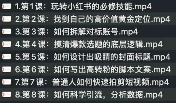 这门《小红书21天实战课》针对想要从零开始打造变现账号的用户,提供完整的冷启动方法论与实操方案。课程覆盖定位、人设、内容、流量、转化等关键环节,帮助学员快速避坑,缩短试错周期,实现从0到1的突破。 ├── 1.第1课:玩转小红书的必修技能.mp4 ├── 2.第2课:找到自己的高价值黄金定位.mp4 ├── 3.第3课:如何拆解对标账号.mp4 ├── 4.第4课:摸清爆款选题的底层逻辑.mp4 ├── 5.第5课:如何设计出吸睛的封面标题.mp4 ├── 6.第6课:如何写出高转粉的脚本文案.mp4 ├── 7.第7课:普通人如何快速拍剪短视频.mp4 ├── 8.第8课:如何科学引流,分析…...