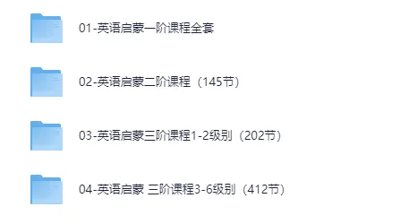 伊森妈妈英语全套合集。 01-英语启蒙—阶课程全套 02-英语启蒙二阶课程(145节) 03-英语启蒙三阶课程1-2级别(202节) 04-英语启蒙三阶课程3-6级别(412节) ├── 01-英语启蒙一阶课程全套 ├── 02-英语启蒙二阶课程(145节) ├── 03-英语启蒙三阶课程1-2级别(202节) ├── 04-英语启蒙 三阶课程3-6级别(412节)...