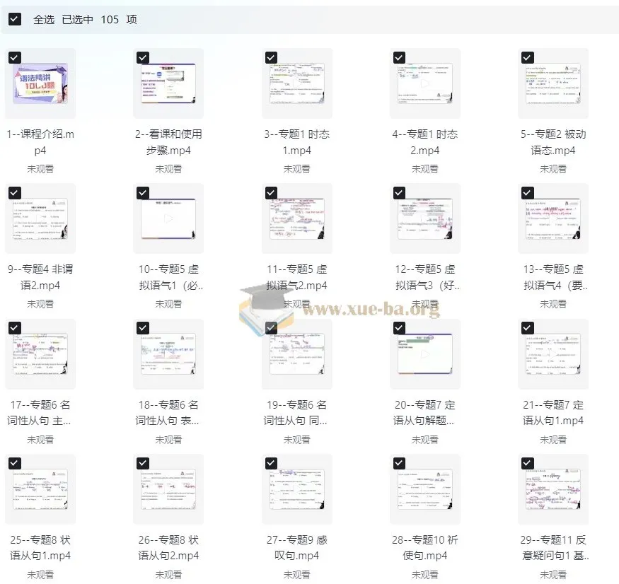 小蕾老师英语语法1000题专项精讲。 小蕾老师英语语法1000题专项精讲是一套系统的英语语法课程,涵盖25余个语法知识点,包括时态、语态、主谓一致、非谓语、虚拟语气等,通过100多节课和200多页习题,提供全面复习和集中突破,适合有基本功底的学生,帮助学生掌握英语语法规则,提升做题能力。 ├── 1--课程介绍.mp4 ├── 2--看课和使用步骤.mp4 ├── 3--专题1 时态1.mp4 ├── 4--专题1 时态2.mp4 ├── 5--专题2 被动语态.mp4 ├── 6--专题3 主谓一致1.mp4 ├── 7--专题3 主谓一致2.mp4 ├── 8--专题4 非谓语1.mp4 …...