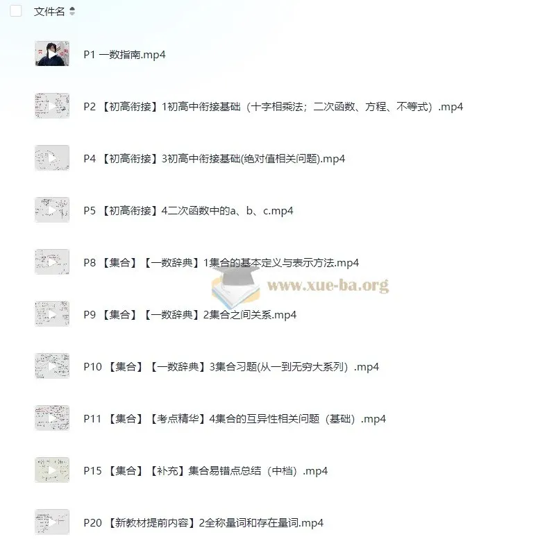 《高中数学 数学辞典 知识点击破》轻松搞定数学难题。 覆盖了高中数学的核心知识点,包括但不限于集合、函数、三角函数、数列、立体几何、解析几何、概率统计等模块。通过详细讲解每个知识点的概念、定理、公式及其应用,该辞典帮助学生构建起系统的数学知识体系。 ├── P1 一数指南.mp4 ├── P2 【初高衔接】1初高中衔接基础(十字相乘法;二次函数、方程、不等式).mp4 ├── P4 【初高衔接】3初高中衔接基础(绝对值相关问题).mp4 ├── P5 【初高衔接】4二次函数中的a、b、c.mp4 ├── P8 【集合】【一数辞典】1集合的基本定义与表示方法.mp4 ├── P9 【集合】【一数…...