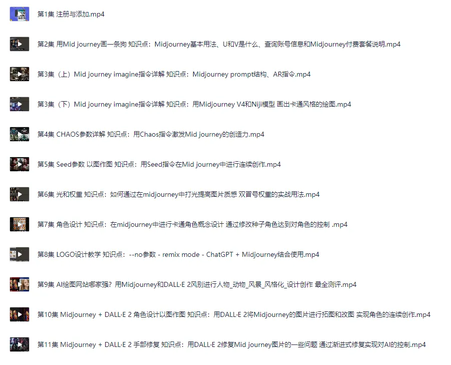 Midjourney入门到精通 AI绘图作画教学 教程目录: 第1集 注册与添加 第2集 用Mid journey画一条狗 知识点:Midjourney基本用法、U和V是什么、查询账号信息和Midjourney付费套餐说明 第3集(上)Mid journey imagine指令详解 知识点:Midjourney prompt结构、AR指令 第3集(下)Mid journey imagine指令详解 知识点:用Midjourney V4和Niji模型 画出卡通风格的绘图 第4集 CHAOS参数详解 知识点:用Chaos指令激发Mid journey的创造力 第5集 Seed参数 以图作图 知识点…...