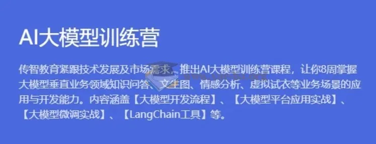 内容涵盖【大模型入门】、【大模型应用初体验】、【大模型初级开发】、【大模型高级开发】、【大模型模型部署】等阶段,学后可独立运用大模型技术开发文生图、情感分析、知识问答等项目。