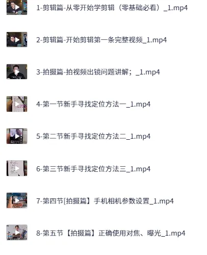 阿火精选手机拍摄剪辑运营实操,课程。本课程体系由阿火精心打造,涵盖了短视频创作的各个环节,适合零基础学员逐步掌握从拍摄到变现的全流程技能。课程还提供了影视剪辑、手机摄影、直播流程、涨粉技巧等实用内容,全面提升学员的短视频创作与运营能力。通过系统学习,学员将掌握短视频拍摄、剪辑、运营、变现的核心技能,打造高质量内容,实现从新手到达人的转变。剪辑篇 从基础操作界面入手,逐步深入到视频添加音乐、字幕、配音、调色、封面制作等内容。 课程还包括炫酷卡点视频、分屏、画中画、烟雾文字、KTV字幕等特效的制作方法,以及蒙版、曲线变速、慢动作、分身、下雪效果等高级技巧。拍摄篇 讲解了手机相机参数设置、对焦与噪光…...
