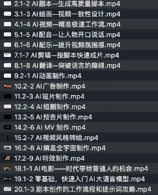 AI电影制作实操人人都能做。 《AI电影制作》是利用人工智能技术和方法,来完成整部电影制作的一门实操课。 也是利用AI技术,来实现AI视频领域创业的实战课。 AI科技的浪潮,犹如海啸般冲击着内容生成领域,AI视频的爆发,将给影视行业带来深刻的变革。 本课程专注于AI技术在电影、视频领域的应用与落地。 ├── 1.1-1 先导课—课程定位与价值.mp4 ├── 2.1-2 AI剧本—生成高质量脚本.mp4 ├── 3.1-3 AI绘画—视频一致性设计.mp4 ├── 4.1-4 AI视频—精准极速工作流.mp4 ├── 5.1-5 AI配音—让人物开口说话.mp4 ├── 6.1-6 AI配乐—…...