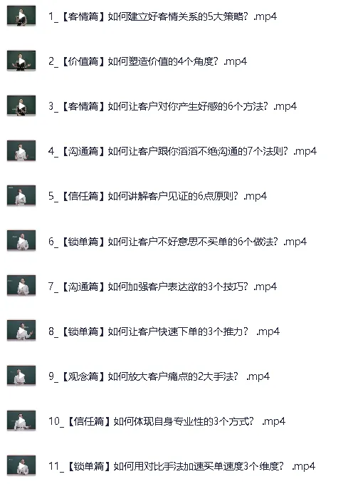 销售必学成交秘籍36法门+成交21招。 成交秘籍36法门+成交21招,本课程结合了《成交秘籍36法门》和《成交21招》,通过理论与实战相结合的方式,全面讲解如何提升销售技巧、建立客户信任、加速成交过程,解决实际销售过程中常见的难题。课程内容涉及如何洞察客户需求、运用谈判技巧、处理客户异议等,帮助学员在竞争激烈的市场中脱颖而出,提高成交率,全面提升销售业绩。 ├── 1_【客情篇】如何建立好客情关系的5大策略?.mp4 ├── 2_【价值篇】如何塑造价值的4个角度?.mp4 ├── 3_【客情篇】如何让客户对你产生好感的6个方法?.mp4 ├── 4_【沟通篇】如何让客户跟你滔滔不绝沟通的7个法…...