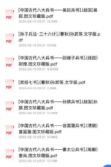 中国古代八大兵书。 书名:中国古代八大兵书 作者:合集 格式:PDF 标签:传统 兵书 日期:2025-05-11 排兵布阵,攻城掠地,古人用兵军事智慧结晶 ├── [孙子兵法·三十六计].(春秋)孙武等.文字版.pdf ├── [武经七书].(春秋)孙武等.文字版.pdf ├── [中国古代八大兵书——曾国藩兵书].(清朝)曾国藩.图文珍藏版.pdf ├── [中国古代八大兵书——姜太公兵书].(周朝)姜尚.图文珍藏版.pdf ├── [中国古代八大兵书——孙膑兵书].(战国)孙膑.图文珍藏版.pdf ├── [中国古代八大兵书——尉缭子兵书].(战国)尉缭.图文珍藏版.pdf ├── [中…...