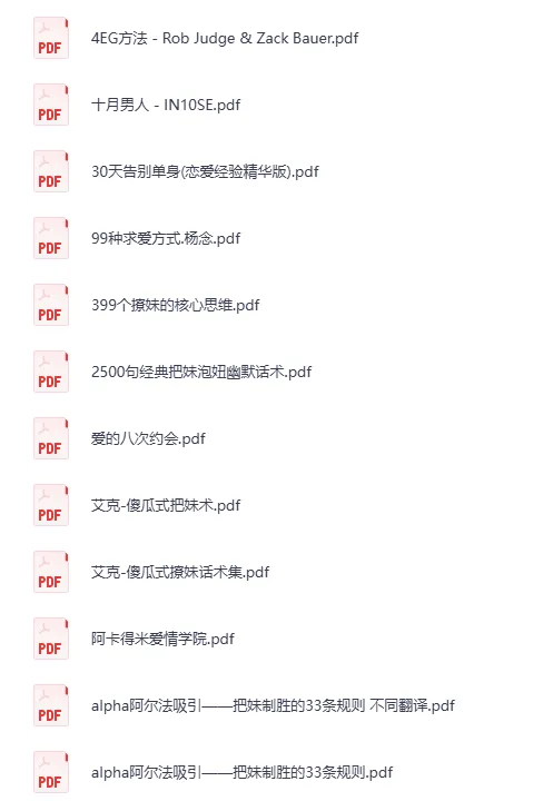 男性泡妞情感电子书合集免费分享,一共700多本,11GB左右 非常全面,有分类和推荐,本本经典 有教你跟女孩怎么聊天、怎么搭讪、怎么约会等等干货 有谜男方法、约会倍增术、红丸觉醒、舔狗消杀手册、防捞女宝典、男性婚前防坑手册等等,一大堆 A 泡妞推荐 B 把妹达人 C 搭讪话术 D 把妹Epub E 魅力男人 G 约会秘籍 H 恋爱高手 解读女人 J基因 K 性知识 L知乎专栏 M 红丸米格道 O 婚姻 Z两性及社会...