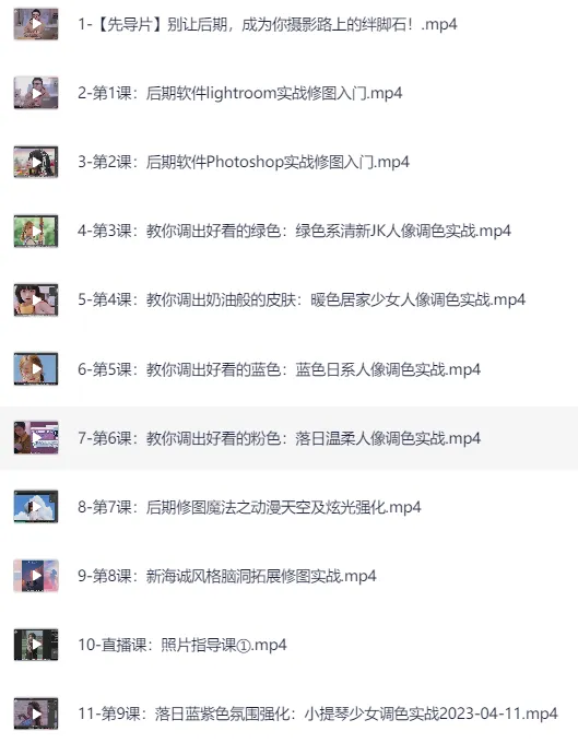 人像修图调色实战训练营课。 这门课程专注于人像修图与调色技巧,通过实战演练提升学员的修图水平。学员将学习肤色处理、光影调整、背景虚化等实用技能,掌握人像修图的艺术和技术要点。课程注重实操,带您探索人像修图的无限可能,提升创作水平。 ├── 1-【先导片】别让后期,成为你摄影路上的绊脚石!.mp4 ├── 2-第1课:后期软件lightroom实战修图入门.mp4 ├── 3-第2课:后期软件Photoshop实战修图入门.mp4 ├── 4-第3课:教你调出好看的绿色:绿色系清新JK人像调色实战.mp4 ├── 5-第4课:教你调出奶油般的皮肤:暖色居家少女人像调色实战.mp4 ├── 6-第…...