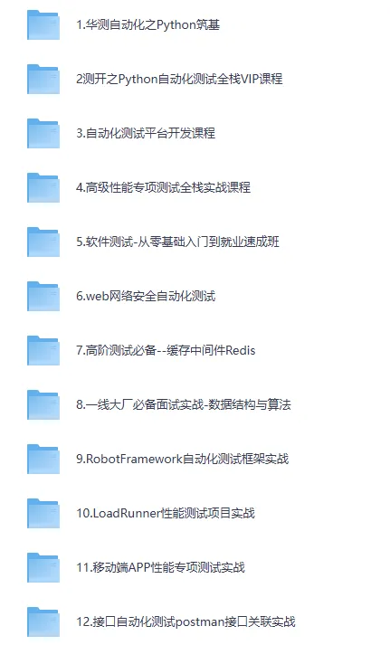 挑战年薪50万,高级测试开发全栈系列课。 全栈系列课(软件测试python全体系课,涵盖软件测试入门,python自动化、测试平台开发、高性能、安全测试等18门课) ├── 1.华测自动化之Python筑基 ├── 2测开之Python自动化测试全栈VIP课程 ├── 3.自动化测试平台开发课程 ├── 4.高级性能专项测试全栈实战课程 ├── 5.软件测试-从零基础入门到就业速成班 ├── 6.web网络安全自动化测试 ├── 7.高阶测试必备--缓存中间件Redis ├── 8.一线大厂必备面试实战-数据结构与算法 ├── 9.RobotFramework自动化测试框架实战 ├── 10.…...