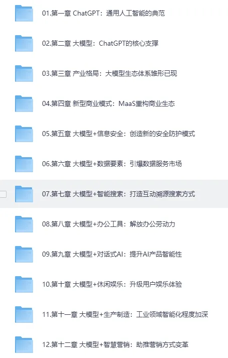 ChatGPT大模型 技术场景与商业应用(2024),赋能千行百业产业链升级,资源下载。 老师带你深入了解国内外大模型生态,助力企业创新应用落地,赋能千行百业产业链升级。主要内容包括:案例:融合了2023年各互联网大厂、研究院、高校等大模型商业应用案例。信息要素新:整理了数据要素、OpenAI首个文生视频模型,Sora等最新信息。技术场景多:讲解了大模型技术要素、产业生态结构,以及新型商业模式等内容。行业种类广:覆盖了医疗、交通、休闲娱乐、电商、金融、工业和制造业等多个行业。...