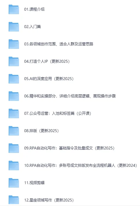 AI+自媒体+RPA变现训练营,写作变现+AI使用+SEO+多平台运营+RPA自动化,课程。本课程针对自媒体写作流水线化趋势,提供从入门到高级的全流程指导。课程对标顶级培训机构,旨在帮助学员通过AI应用、SEO优化和多平台运营实现写作变现。培训涵盖自媒体领域选择、内容创作范围、个人IP打造及深度应用,包括ChatGPT使用、提示词优化和选题库搭建。课程细分模块涉及RPA自动化写作,从基础指令到批量成文、排版发布全流程机器人搭建。另有视频剪辑、星座、时尚穿搭及微头条写作等专题,旨在系统提升内容创作效率和运营能力。...