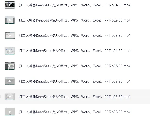 《DeepSeek接入Office、WPS、Word、Excel、PPT》打工人神器,课程。DeepSeek为打工人打造了一款全新的智能办公助手,能够稳定集成到常用的Office与WPS办公套件中。安装后,无需切换软件,就可以在Word、Excel和PPT中直接唤出DeepSeek,为文档检索、数据分析和幻灯片编排提供自动化支持。 ├── 打工人神器DeepSeek接入Office、WPS、Word、Excel、PPT-p01-80.mp4 ├── 打工人神器DeepSeek接入Office、WPS、Word、Excel、PPT-p03-80.mp4 ├── 打工人神器DeepSeek接入Of…...