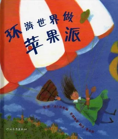 《环游世界做苹果派》是一本很幽默、很荒诞的故事书 ,作者的想象力让人在觉得夸张之余忍俊不禁,封面上的小女孩背着降落伞从天上飘飘荡荡的下来,头发让风刮得往上飘,一手抓着大袋子一手还抱着擀面仗、大勺子……。
