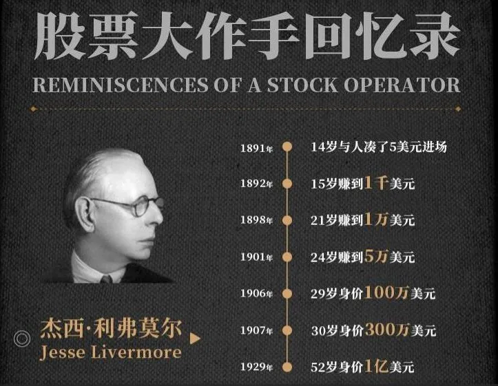 这本书记录了美国股票史上传奇人物杰西·利弗莫尔(Jesse Livermore)的投机生涯。他把天赋、才华和热情倾注在金融市场上。他被人们称为“少年作手”和“华尔街巨熊”。他在14岁与人凑了5美元进场,15岁赚到一千美元,21岁赚到一万美元,24岁赚到五万美元,29岁身价百万美元,30岁身价三百万美元,52岁身价一亿美元。美国总统威尔逊曾亲自召见他,华尔街之王摩根先生也找人跟他协商。1929年,他做空股市赚走一亿美元,成为股票历史上疯狂的大空头。他一生四起四落,赢得很多的掌声,也留下很深的遗憾。他的操作经验至今仍是股市的教科书,被彼得·林奇、巴菲特、格雷厄姆等推崇。