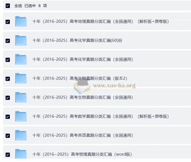 《十年高考真题》全科分类汇编(2014-2024),课程。这套《十年高考真题全科分类汇编》汇集了2014年至2024年全国通用的化学、历史、地理、政治、物理、生物、英语和语文八大学科真题分项整理,同时收录了2015年至2024年高考数学真题分类汇编,覆盖各科核心考点与题型。每个分册均按知识模块和题型特点精细归纳,方便考生针对弱项进行专项练习,实现知识结构的系统梳理与能力提升,为高效复习提供全面支持。 ├── 十年(2014-2024)高考地理真题分项汇编(全国通用) ├── 十年(2014-2024)高考化学真题分项汇编(全国通用) ├── 十年(2014-2024)高考历史真题分项汇编(全国…...