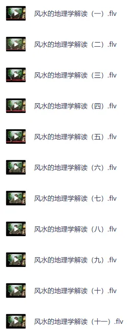 《中国风水55讲》历史悠久的一门玄术。 风水,本为相地之术,即临场校察地理的方法,也叫地相、古称堪舆术,相传风水的创始人是九天玄女,比较完善的风水学问起源于战国时代。 风水的核心思想是人与大自然的和谐,早期的风水主要关乎宫殿、住宅、村落、墓地的选址、座向、建设等方法及原则,原意是选择合适的地方的一门学问。 是中国历史悠久的一门玄术。也称青鸟、青囊,较为学术性的说法叫做堪舆。 ├── 风水的地理学解读(一).flv ├── 风水的地理学解读(二).flv ├── 风水的地理学解读(三).flv ├── 风水的地理学解读(四).flv ├── 风水的地理学解读(五).flv ├── 风水的地理学解…...