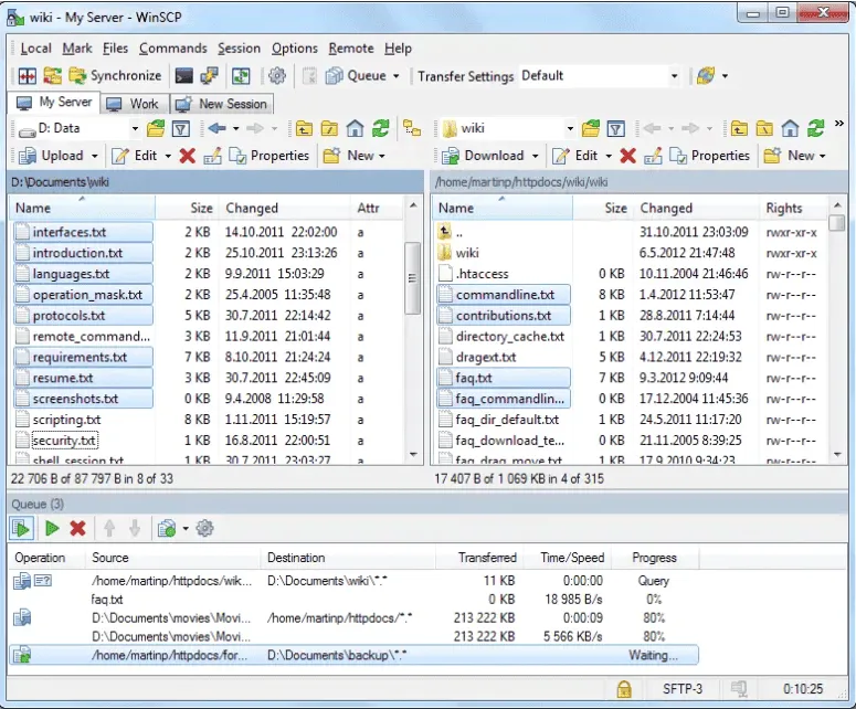 WinSCP 可以执行所有基本的文件操作,例如:下载和上传。同时,允许为文件和目录重命名、改变属性、建立符号链接和快捷方式等等。两种可选界面允许用户管理远程或本地的文件。
