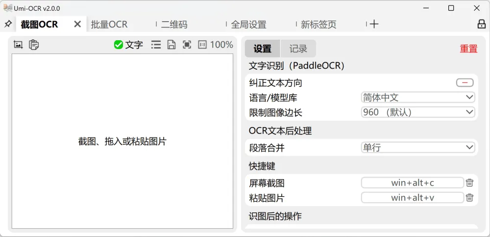 本软件使用离线OCR模块 PaddleOCR-json 图片转文字程序 ,使用过程中无需联网。支持更换Paddle官方模型(v2.x版本)或自己训练的模型,支持修改PaddleOCR参数。通过添加不同的语言模型,软件可识别多国语言。